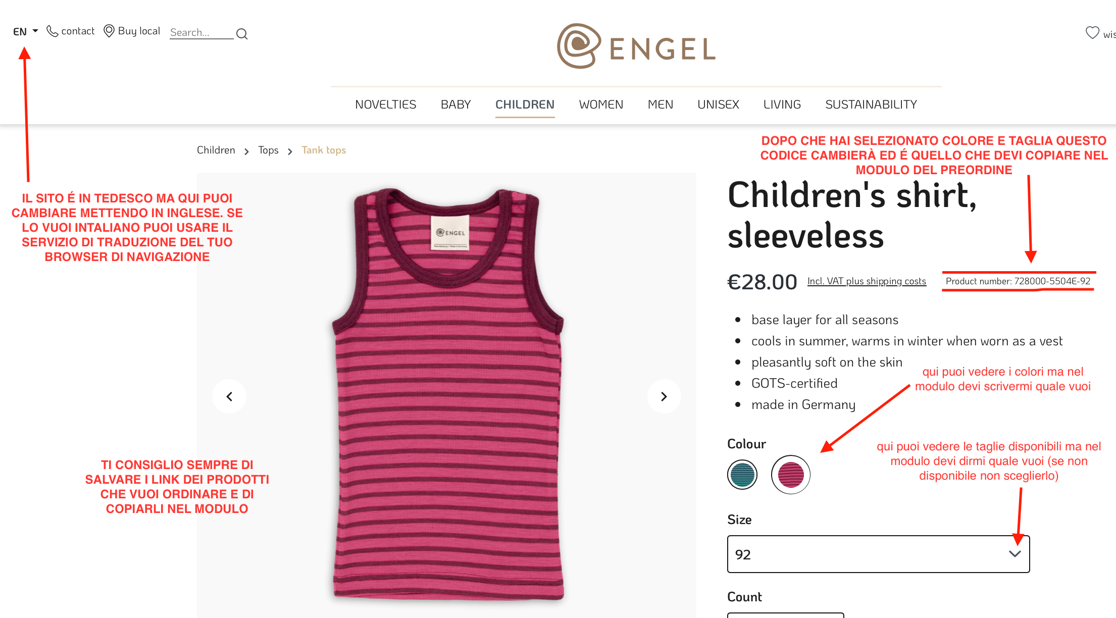 tutto molto semplice. vai sul sito https://engel-natur.de/ e naviga scegliendo il prodotto che ti serve. seleziona taglia e colore. copia il codice del prodotto corrispondente e anche il link al sito stesso.